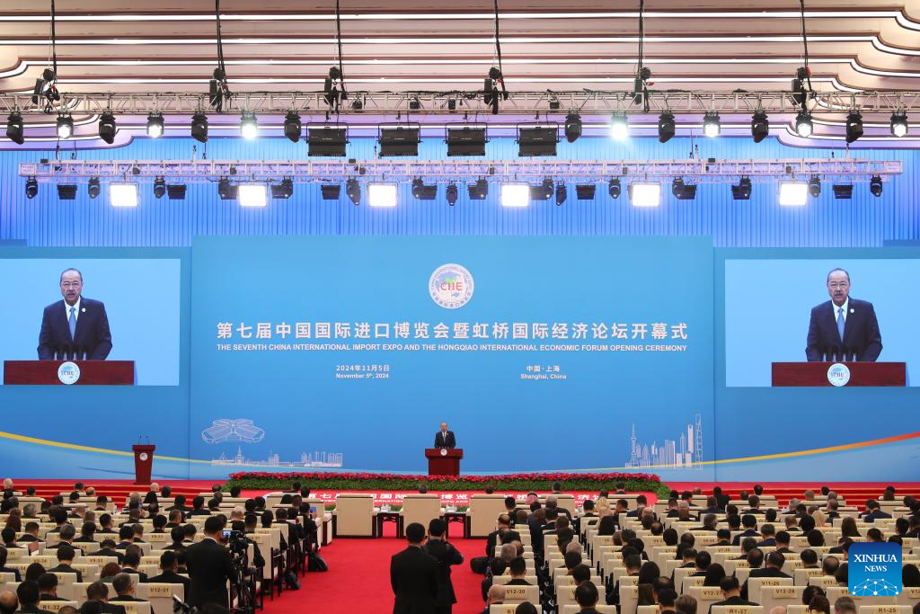 The opening ceremony of the seventh China International Import Expo (CIIE) and the Hongqiao International Economic Forum is held at the National Exhibition and Convention Center (Shanghai) in east China's Shanghai, Nov. 5, 2024. (Xinhua/Du Xiaoyi)