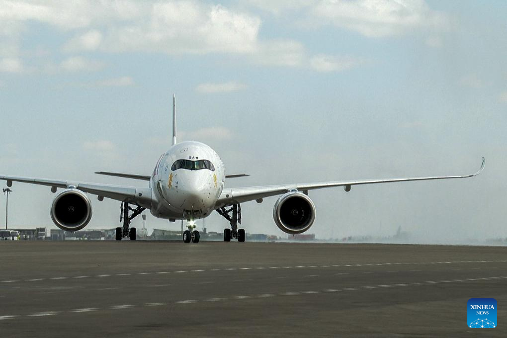 The passenger plane A350-1000, named "Ethiopia: Land of Origins," lands at the Bole International Airport in Addis Ababa, the capital of Ethiopia, Nov. 5, 2024. Ethiopian Airlines has received its first Airbus A350-1000, becoming the first African carrier to operate the largest model in the A350 family. (Xinhua/Michael Tewelde)