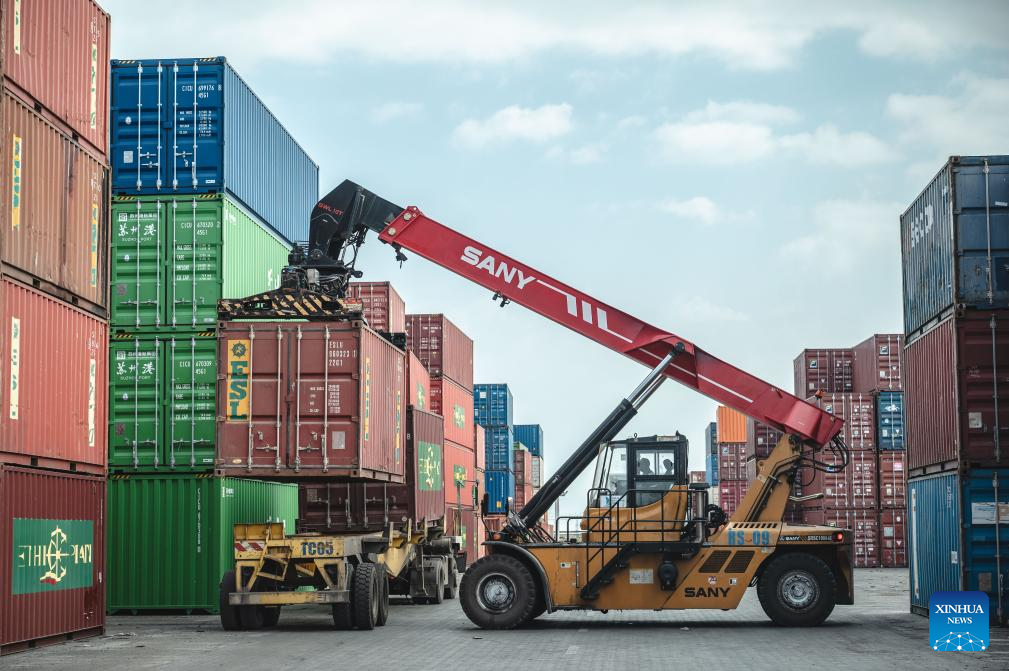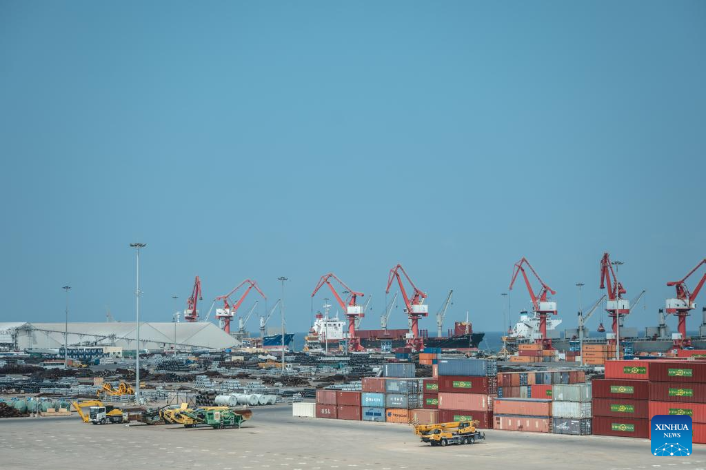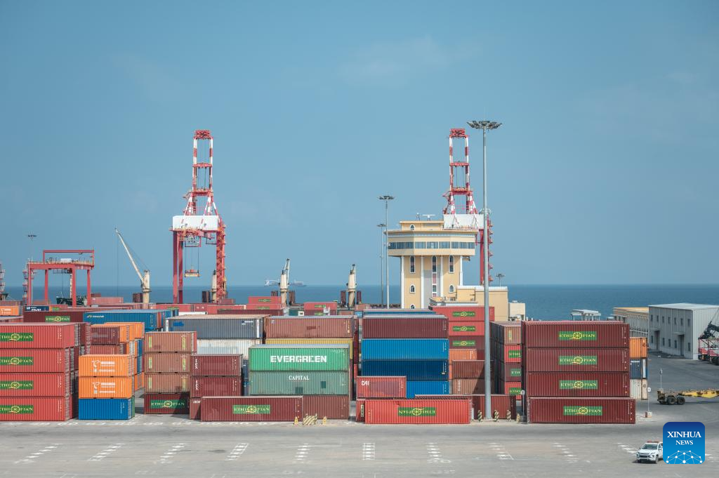 This photo taken on Nov. 8, 2024 shows the Doraleh Multi-Purpose Port in Djibouti City, capital of Djibouti. The Doraleh Multi-Purpose Port, built by Chinese enterprises and officially opened in 2017 with an annual design capacity of 7.08 million tonnes of cargo and 200,000 TEUs in container capacity, has increased the efficiency of vessel operations and reduced berthing time through highly automated and modernized loading and unloading methods, improving the port's competitiveness and cargo handling revenue. (Xinhua/Wang Guansen)