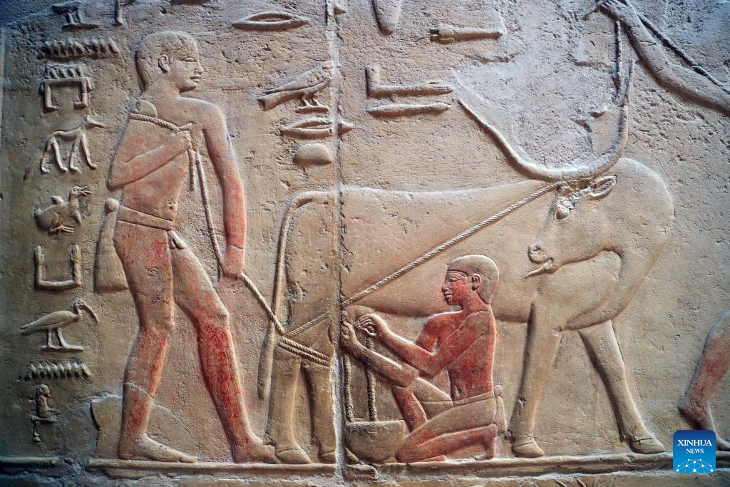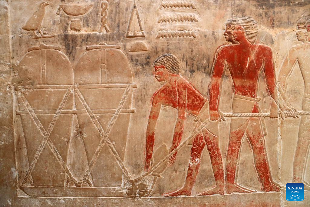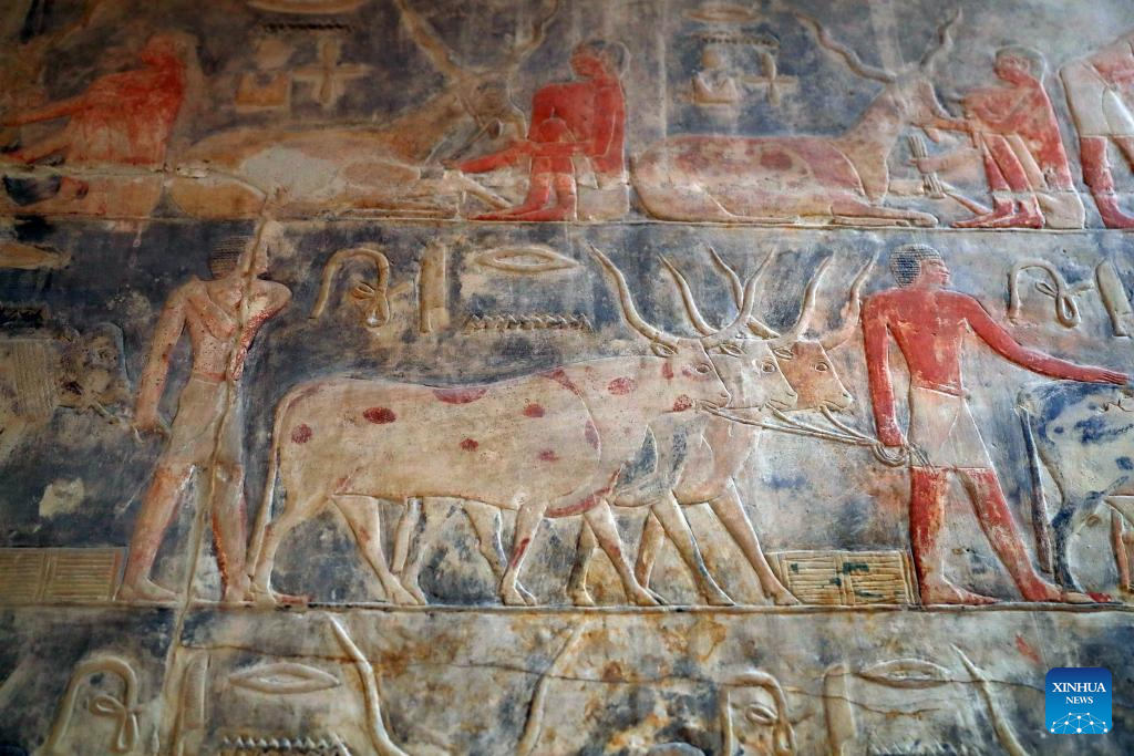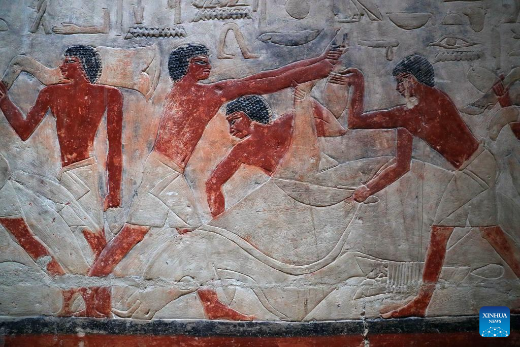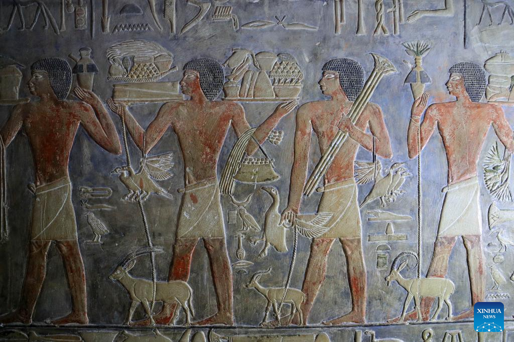 This photo taken on Nov. 12, 2024 shows a colored relief painting inside the tomb of an official of ancient Egypt in Saqqara necropolis, south of Cairo, Egypt. The Saqqara necropolis is home to numbers of noble tombs, in which many colored relief paintings depicting ancient Egyptian daily life are still well preserved. (Xinhua/Sui Xiankai)