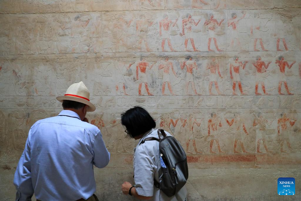 Tourists view colored relief paintings inside the tomb of a an official of ancient Egypt in Saqqara necropolis, south of Cairo, Egypt, Nov. 12, 2024. The Saqqara necropolis is home to numbers of noble tombs, in which many colored relief paintings depicting ancient Egyptian daily life are still well preserved. (Xinhua/Sui Xiankai)