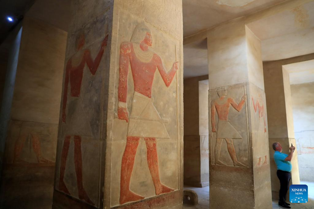 A tourist takes photos of colored relief paintings inside the tomb of an official of ancient Egypt in Saqqara necropolis, south of Cairo, Egypt, Nov. 12, 2024. The Saqqara necropolis is home to numbers of noble tombs, in which many colored relief paintings depicting ancient Egyptian daily life are still well preserved. (Xinhua/Sui Xiankai)