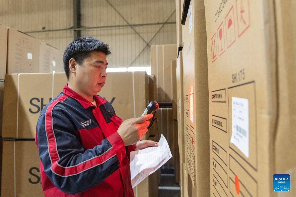 A staff member checks the information of motorcycles to be exported to Latin America at Chongqing Shineray Motorcycle Co., Ltd. in Chongqing, southwest China, Nov. 13, 2024. Shineray is an export-oriented enterprise based in Chongqing, with its products mainly targeting Latin American market.