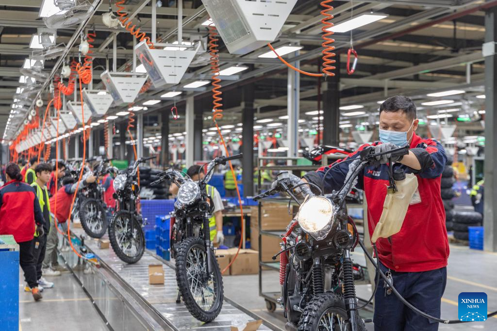 Staff members work on an assembly line at Chongqing Shineray Motorcycle Co., Ltd. in Chongqing, southwest China, Nov. 13, 2024. Shineray is an export-oriented enterprise based in Chongqing, with its products mainly targeting Latin American market.