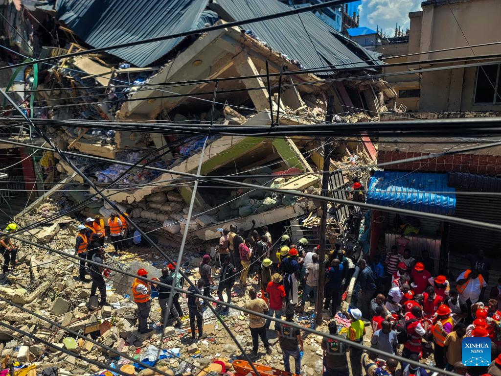 This photo shows a collapsed building in the Kariakoo suburb of Dar es Salaam, Tanzania, on Nov. 16, 2024. Tanzanian Prime Minister Kassim Majaliwa announced on Saturday that one person was killed and 28 others were injured when a four-story building collapsed in the Kariakoo suburb of Dar es Salaam, the country's port city. (Str/Xinhua)