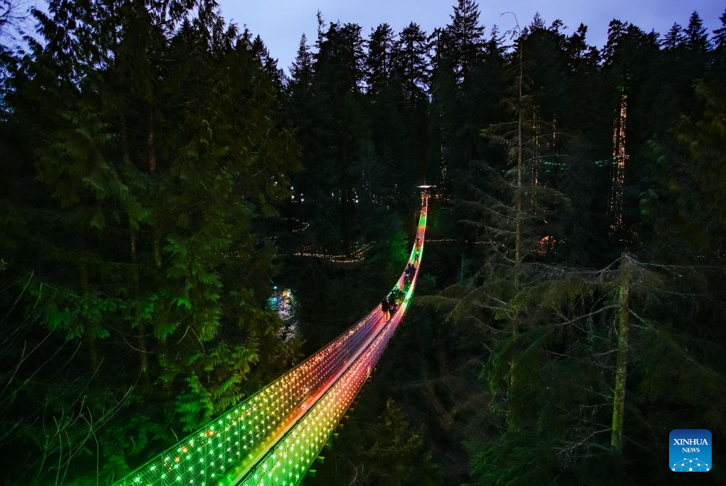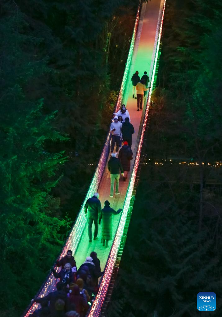 Visitors stroll across an illuminated suspension bridge during the Canyon Lights preview event at Capilano Suspension Bridge Park in North Vancouver, British Columbia, Canada, Nov. 21, 2024. The annual event features illuminated suspension bridges, rainforest trails, and treetop walkways in a festive celebration. It runs from Nov. 22, 2024 to Jan. 19, 2025. (Photo by Liang Sen/Xinhua)