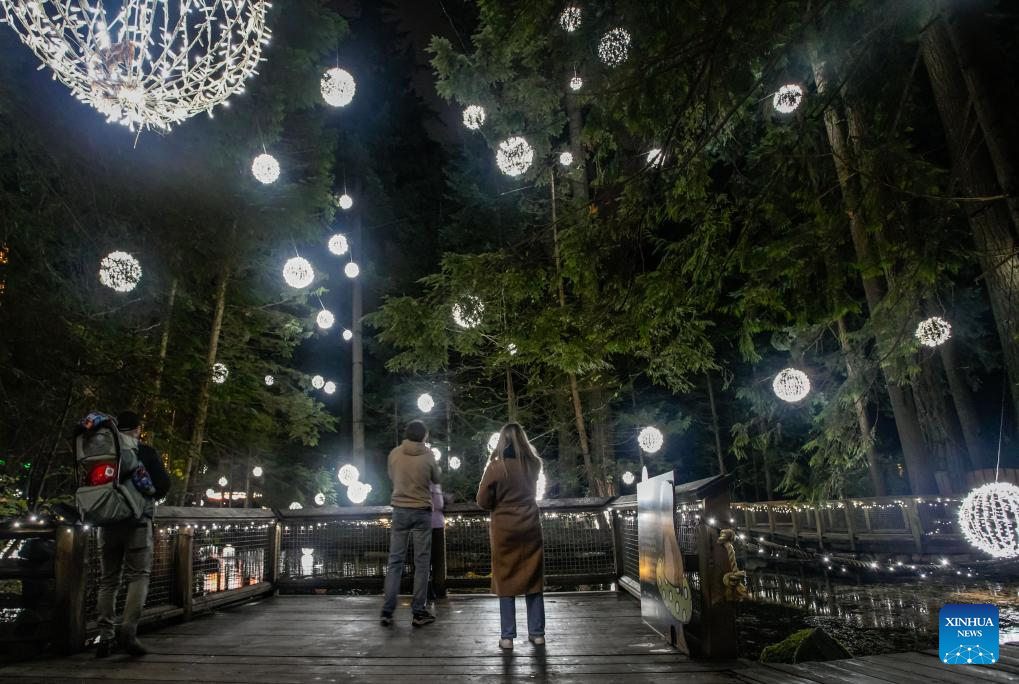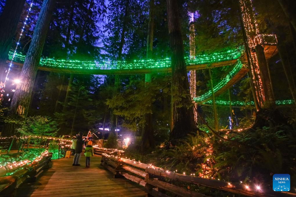 Visitors view light decorations during the Canyon Lights preview event at Capilano Suspension Bridge Park in North Vancouver, British Columbia, Canada, Nov. 21, 2024. The annual event features illuminated suspension bridges, rainforest trails, and treetop walkways in a festive celebration. It runs from Nov. 22, 2024 to Jan. 19, 2025. (Photo by Liang Sen/Xinhua)