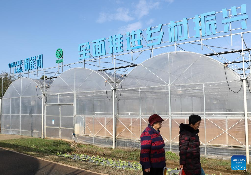 Villagers walk past the smart greenhouses of the Yangque Lake Zhangshugang pepper planting base in Zhangshu Town of Yueyang City, central China's Hunan Province, Nov. 26, 2024. Hunan, a main pepper planting area in China, has been advancing the application of smart greenhouses in pepper planting industry through combined efforts. (Xinhua/Wang Jingqiang)