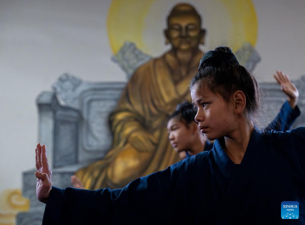 Students practice Tai Chi at a martial arts school in Shiyan City in central China's Hubei Province, Nov. 28, 2024. Tai Chi, a centuries-old Chinese martial art focusing on both internal and external practices, involves a series of slow, gentle movements and physical postures, a meditative state of mind, and controlled breathing. Statistics show that over 100 million people across more than 150 countries and regions practice Tai Chi, with about 30,000 foreigners traveling to the Wudang Mountain annually to learn and experience it. (Xinhua/Wang Yuguo)