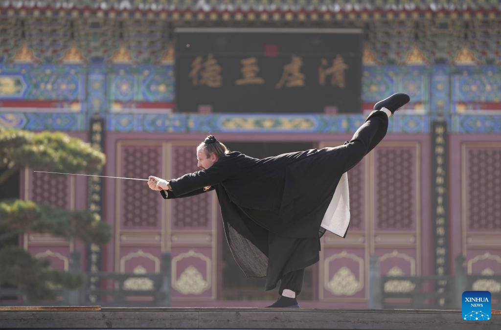 Jake Pinnick practices martial arts at Yuxu Gong Temple in Shiyan City in central China's Hubei Province, Nov. 29, 2024. An American who traveled to the Wudang Mountain to study martial arts in 2010, Jake Pinnick now serves as an instructor, imparting knowledge of Tai Chi and Chinese culture to a global audience. Tai Chi, a centuries-old Chinese martial art focusing on both internal and external practices, involves a series of slow, gentle movements and physical postures, a meditative state of mind, and controlled breathing. Statistics show that over 100 million people across more than 150 countries and regions practice Tai Chi, with about 30,000 foreigners traveling to the Wudang Mountain annually to learn and experience it. (Xinhua/Hu Jingwen)