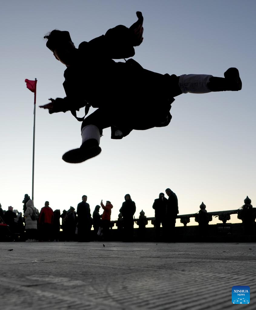 A Taoist priest practices martial arts at "golden peak" on the Wudang Mountain in Shiyan City in central China's Hubei Province, Nov. 29, 2024. Tai Chi, a centuries-old Chinese martial art focusing on both internal and external practices, involves a series of slow, gentle movements and physical postures, a meditative state of mind, and controlled breathing. Statistics show that over 100 million people across more than 150 countries and regions practice Tai Chi, with about 30,000 foreigners traveling to the Wudang Mountain annually to learn and experience it. (Xinhua/Cai Yang)