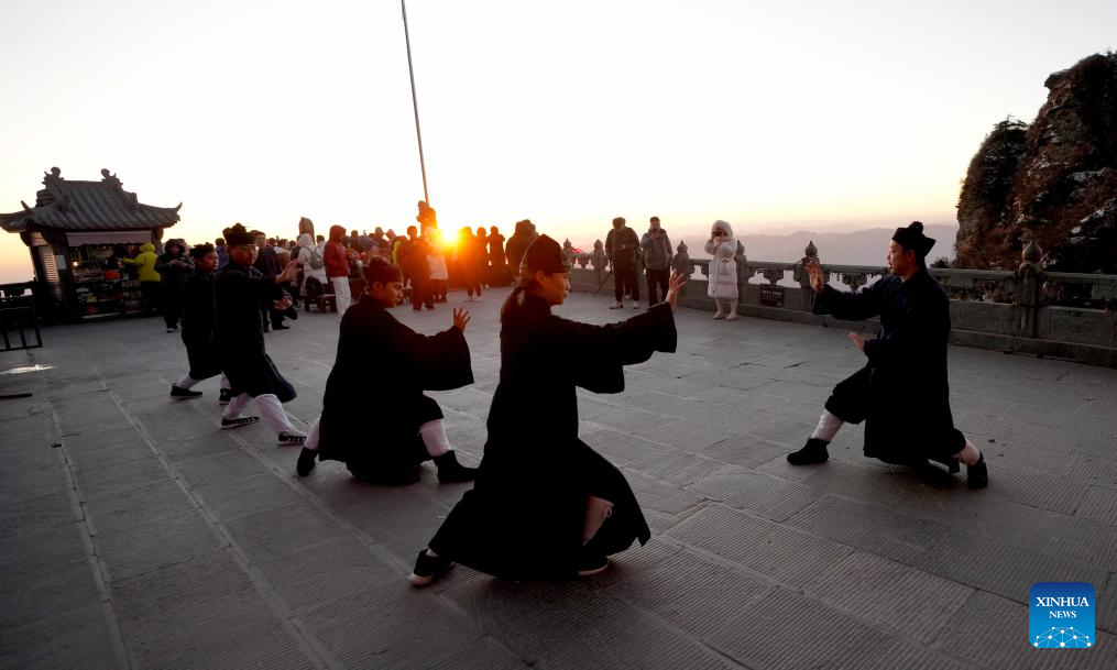 Taoist priests practice martial arts at "golden peak" on the Wudang Mountain in Shiyan City in central China's Hubei Province, Nov. 29, 2024. Tai Chi, a centuries-old Chinese martial art focusing on both internal and external practices, involves a series of slow, gentle movements and physical postures, a meditative state of mind, and controlled breathing. Statistics show that over 100 million people across more than 150 countries and regions practice Tai Chi, with about 30,000 foreigners traveling to the Wudang Mountain annually to learn and experience it. (Xinhua/Wang Yuguo)