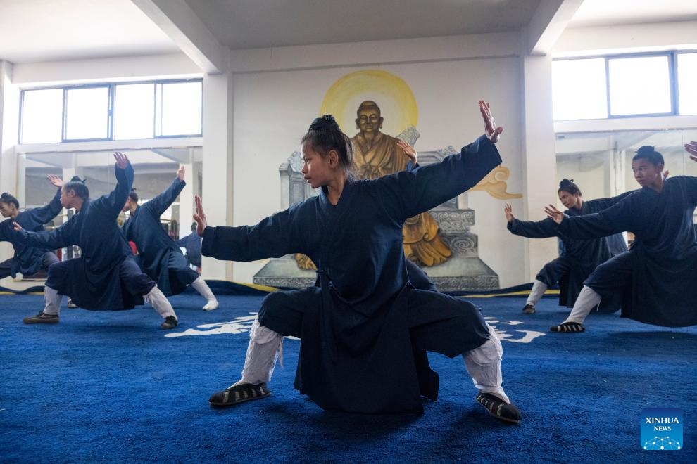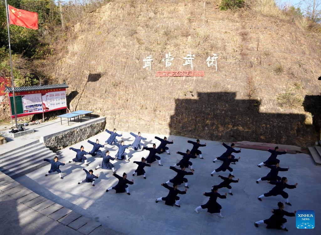 Students practice Tai Chi at a martial arts school in Shiyan City in central China's Hubei Province, Nov. 28, 2024. Tai Chi, a centuries-old Chinese martial art focusing on both internal and external practices, involves a series of slow, gentle movements and physical postures, a meditative state of mind, and controlled breathing. Statistics show that over 100 million people across more than 150 countries and regions practice Tai Chi, with about 30,000 foreigners traveling to the Wudang Mountain annually to learn and experience it. (Xinhua/Wu Zhizun)
