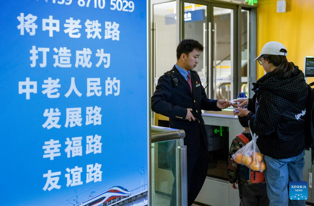 A staff member checks the ticket for a passenger at Huanian Railway Station of the China-Laos Railway in southwest China's Yunnan Province, Dec. 1, 2024. The China-Laos Railway has emerged as a catalyst for regional economic growth three years after its launch, China's railway operator said on Tuesday.