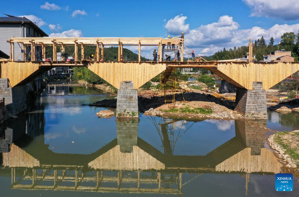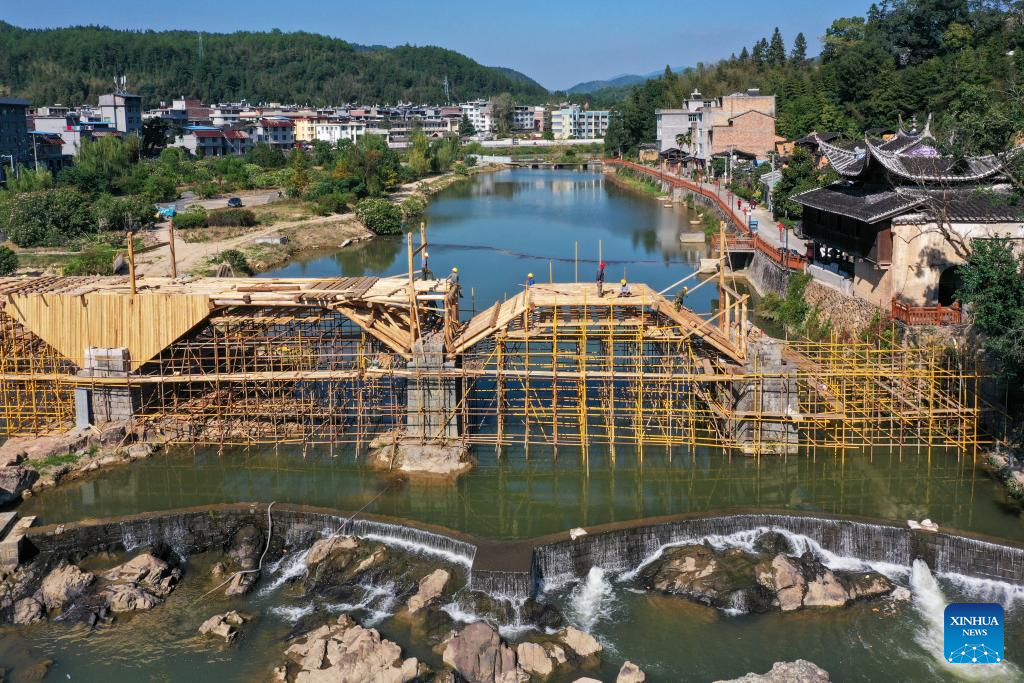 A drone photo taken on Oct. 18, 2023 shows workers working on the restoration of the Wan'an Bridge, a wooden arch bridge, in Changqiao Township of Pingnan County, southeast China's Fujian Province.(Photo by Wang Zhiling/Xinhua)