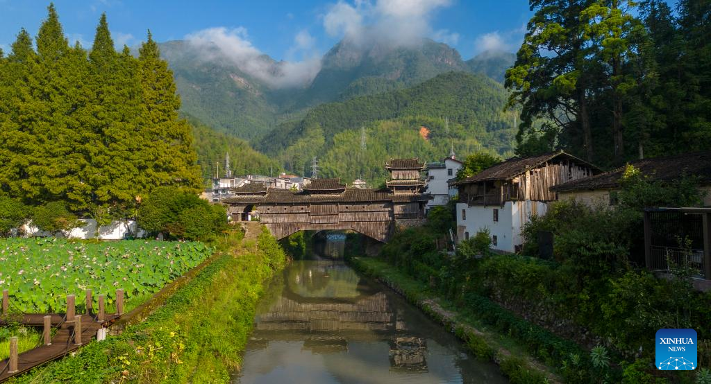 A drone photo taken on Aug. 18, 2022 shows the Rulong Bridge, a wooden arch bridge, in Qingyuan County of Lishui City, east China's Zhejiang Province.(Photo by Wu Chunping/Xinhua)