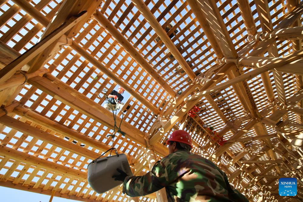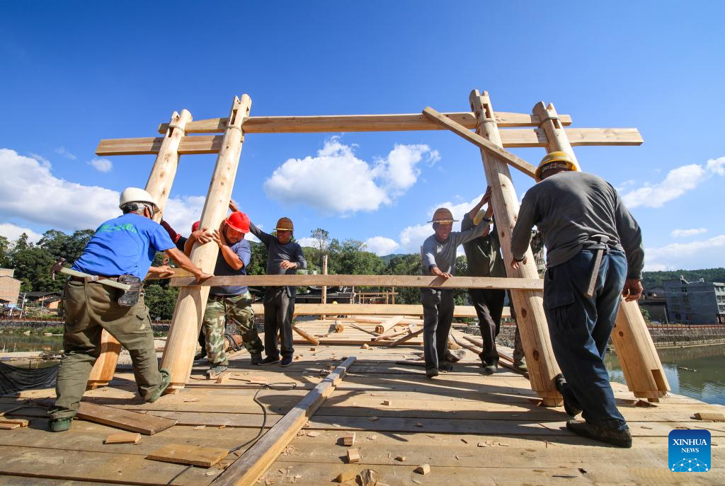 Workers work on the restoration of the Wan'an Bridge, a wooden arch bridge, in Changqiao Township of Pingnan County, southeast China's Fujian Province, Nov. 2, 2023.(Photo by Wang Zhiling/Xinhua)