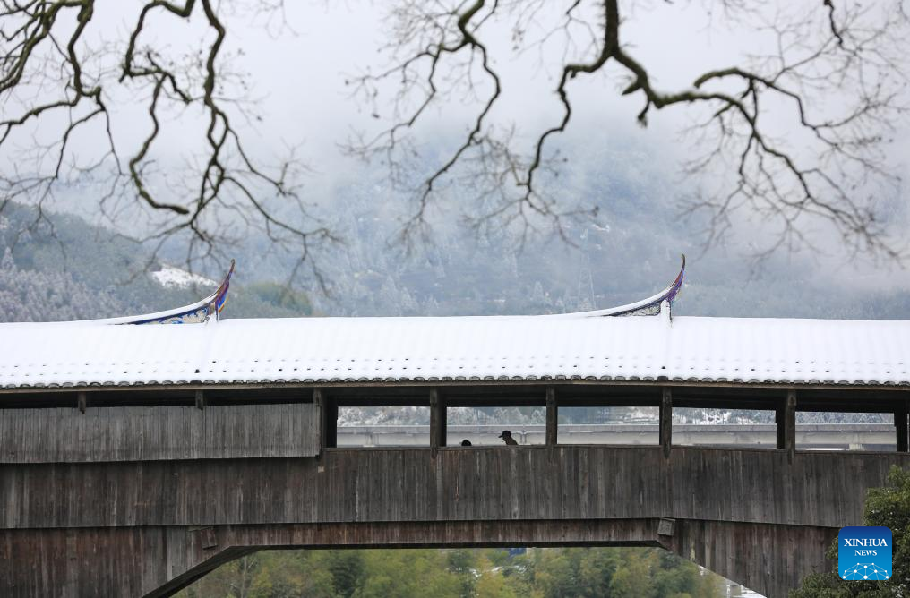 An aerial drone photo taken on Jan. 23, 2024 shows the Yonggui Bridge, a wooden arch bridge, after snowfall in Qingyuan County of Lishui City, east China's Zhejiang Province.(Photo by Wu Chunping/Xinhua)