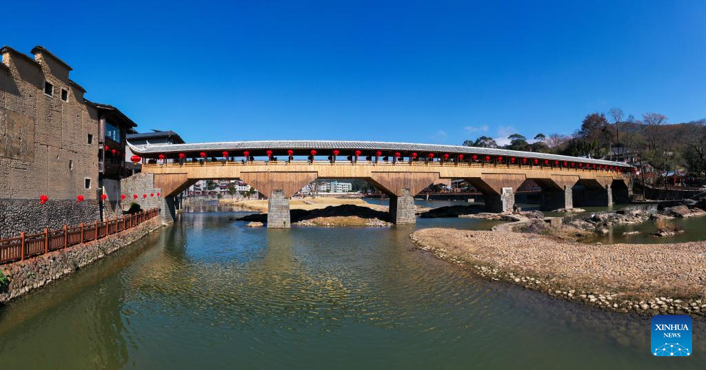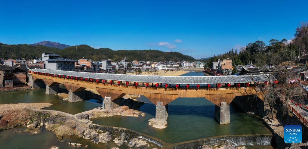 This photo taken on Feb. 21, 2022 shows the Qiancheng Bridge, a wooden arch bridge, in Tangkou Township of Pingnan County, southeast China's Fujian Province.(Photo by Wang Zhiling/Xinhua)