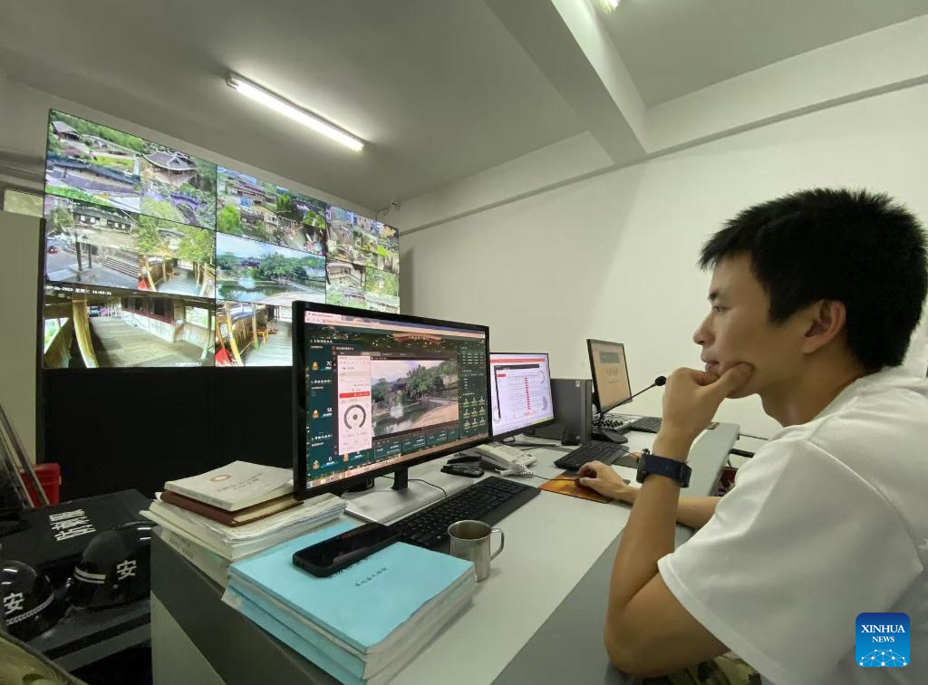(241206) -- WENZHOU, Dec. 6, 2024 (Xinhua) -- A staff member uses the cultural heritage supervision and protection platform to monitor the situation of an arch bridge in Taishun County of Wenzhou City, east China's Zhejiang Province, July 26, 2023. (Xinhua/Wei Yijun)