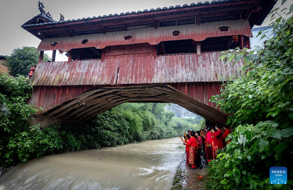 Villagers participate in a traditional folk activity of the Duanwu Festival, or the Dragon Boat Festival, at Shuangmen Bridge, a wooden arch bridge, in Qingyuan County of Lishui City, east China's Zhejiang Province, June 11, 2024.(Photo by Wu Chunping/Xinhua)
