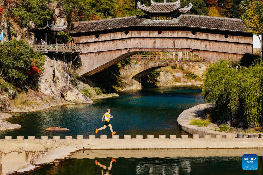 A man runs past a wooden arch bridge in Qingyuan County of Lishui City, east China's Zhejiang Province, Nov. 25, 2023. (Xinhua)