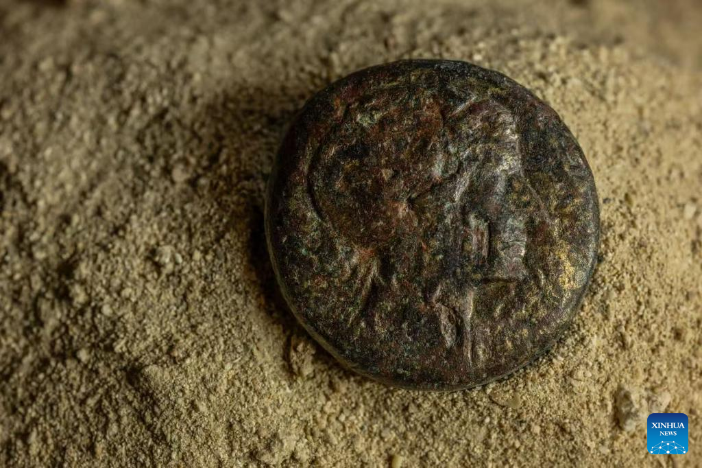 This undated photo shows a coin uncovered at the Taposiris Magna temple complex west of Alexandria, Egypt.(Egyptian Ministry of Tourism and Antiquities/Handout via Xinhua)