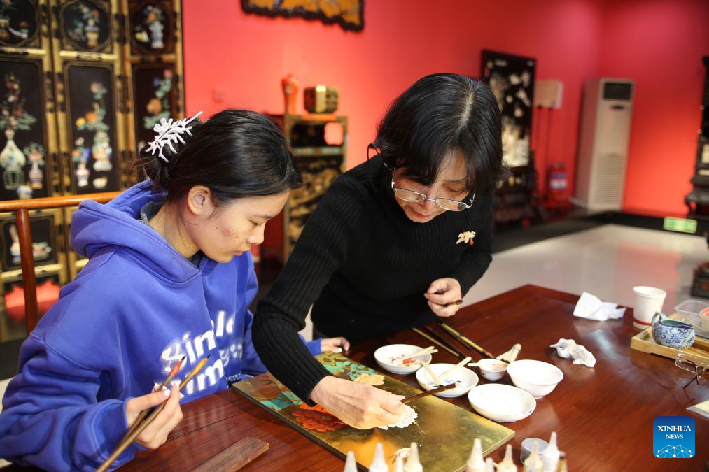 Hu Xin instructs an apprentice on a Gold Lacquer Inlay artwork at the Beijing Gold Lacquer Inlay Art Museum in Beijing, capital of China, Dec. 10, 2024. (Xinhua/Li Xin)