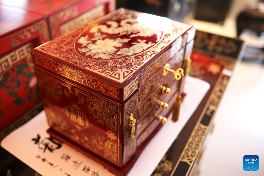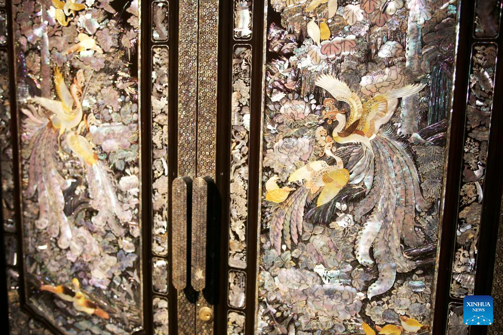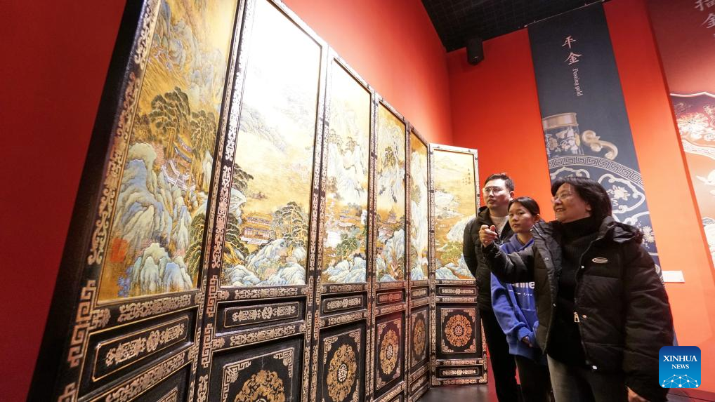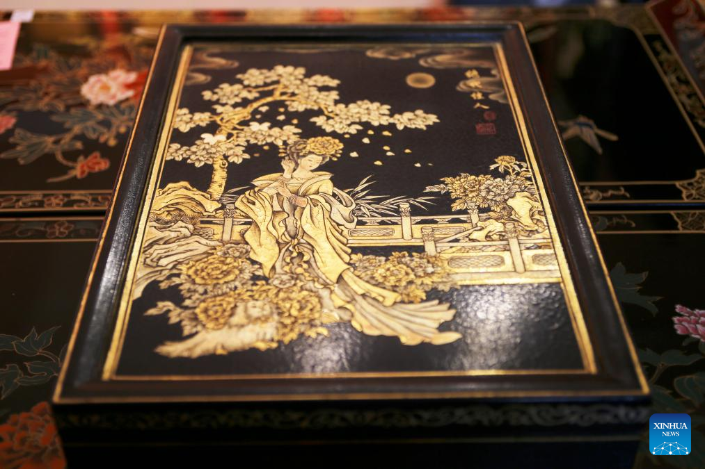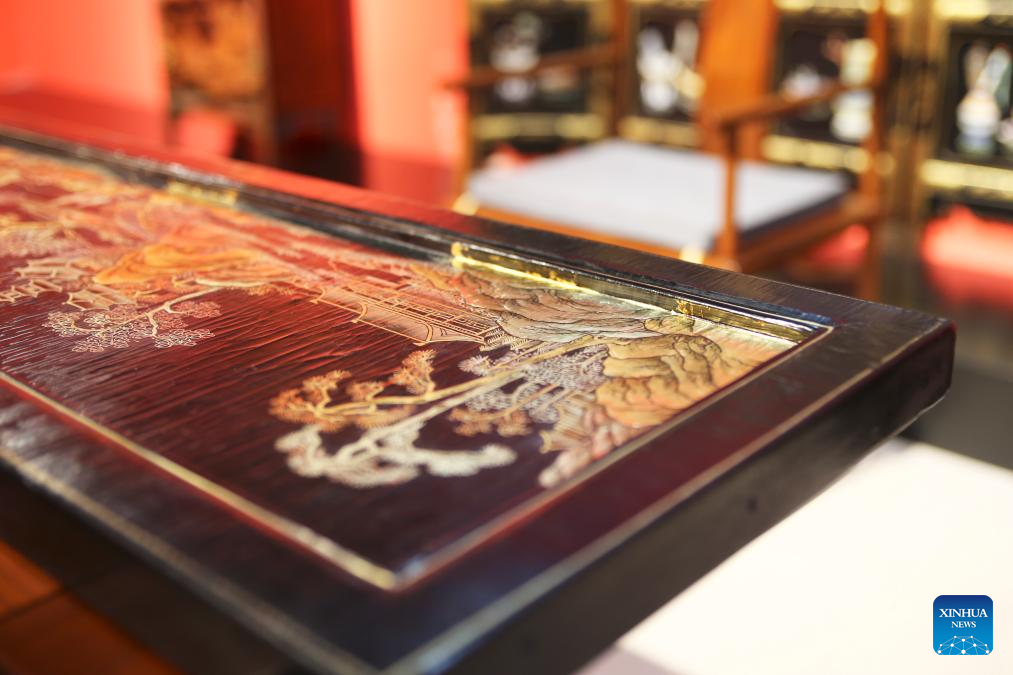 Furniture of Gold Lacquer Inlay Art are displayed at the Beijing Gold Lacquer Inlay Art Museum in Beijing, capital of China, Dec. 10, 2024. Gold Lacquer Inlay Art, a main category of traditional Chinese lacquer art, has a history of more than 7,000 years. The Beijing gold lacquer inlay art, developing on the basis of the imperial art dating back to the Ming (1368-1644) and Qing (1644-1911) dynasties, has formed a classically elegant and splendid Beijing-style. The art has been applied to a wide range of aspects in life, from pillars in ancient buildings, screens, thrones and furniture in the palace, to tableware, tea sets, writing materials and jewelry in people's daily life.