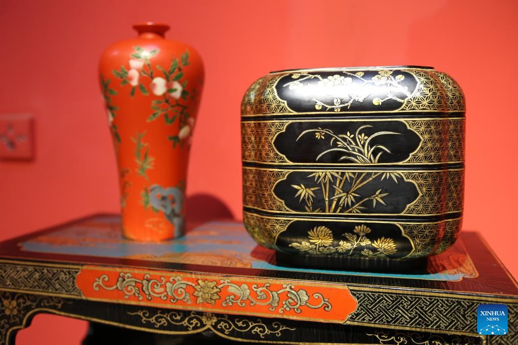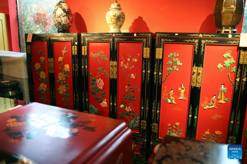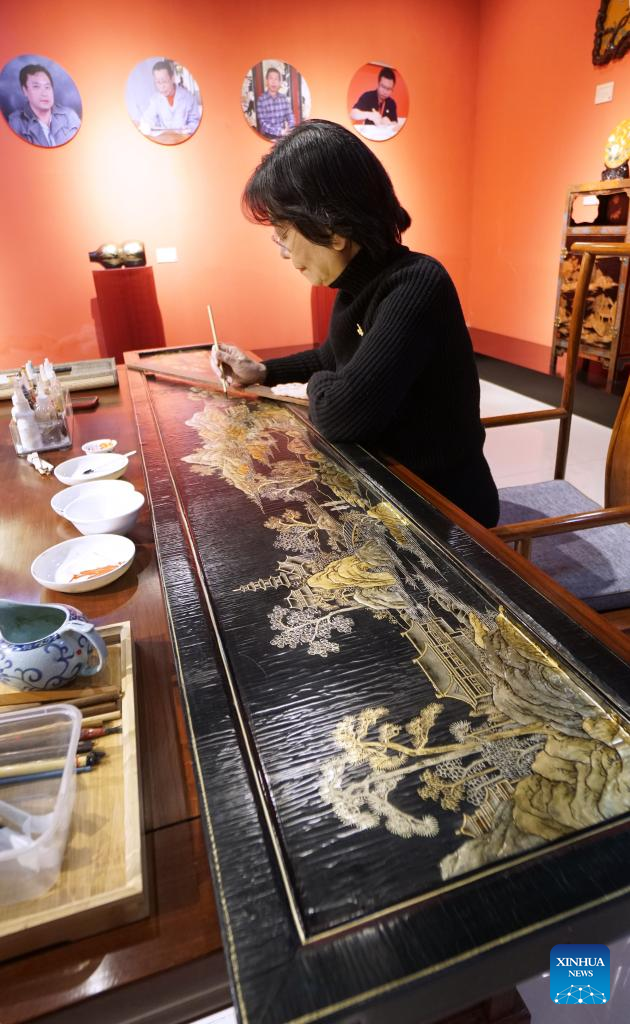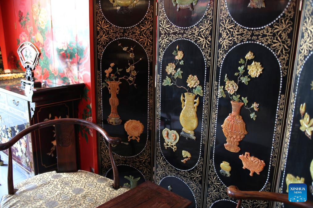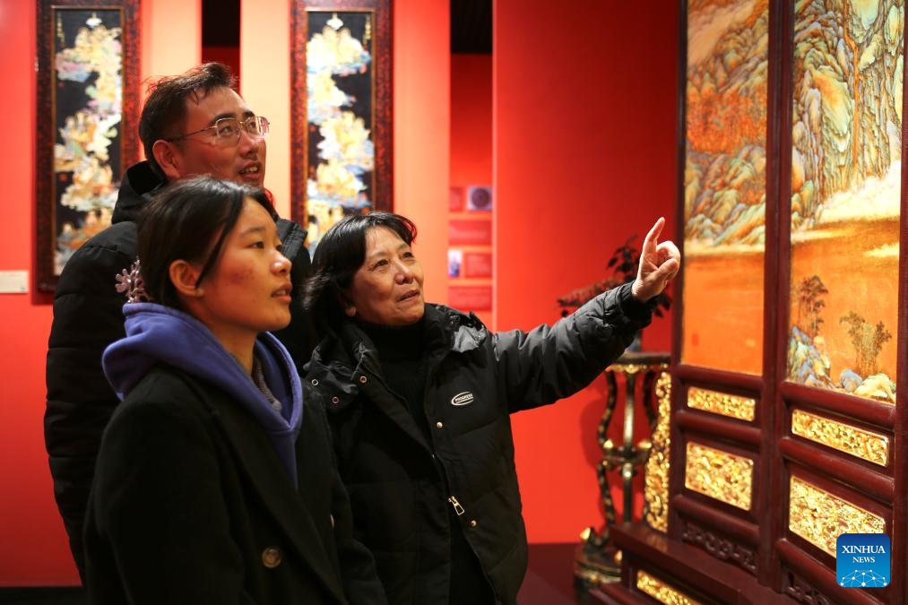 Furniture of Gold Lacquer Inlay Art are displayed at the Beijing Gold Lacquer Inlay Art Museum in Beijing, capital of China, Dec. 10, 2024. Gold Lacquer Inlay Art, a main category of traditional Chinese lacquer art, has a history of more than 7,000 years. The Beijing gold lacquer inlay art, developing on the basis of the imperial art dating back to the Ming (1368-1644) and Qing (1644-1911) dynasties, has formed a classically elegant and splendid Beijing-style. The art has been applied to a wide range of aspects in life, from pillars in ancient buildings, screens, thrones and furniture in the palace, to tableware, tea sets, writing materials and jewelry in people's daily life.