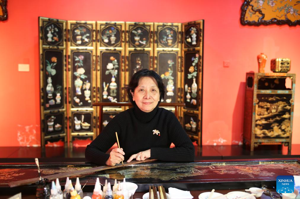 Hu has trained about ten apprentices, some of whom have become arts and crafts masters in Beijing. In 2015, the Beijing Gold Lacquer Inlay Co., Ltd. started cooperation with Beijing Arts & Design Technology Institute in training new talents. As a visiting professor, Hu has given lectures every week in the institute since then. In 2019, Hu also set up a studio of her own. (Xinhua/Zhu Weixi)