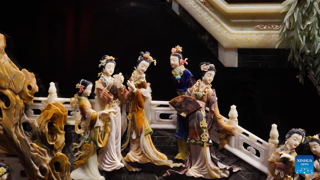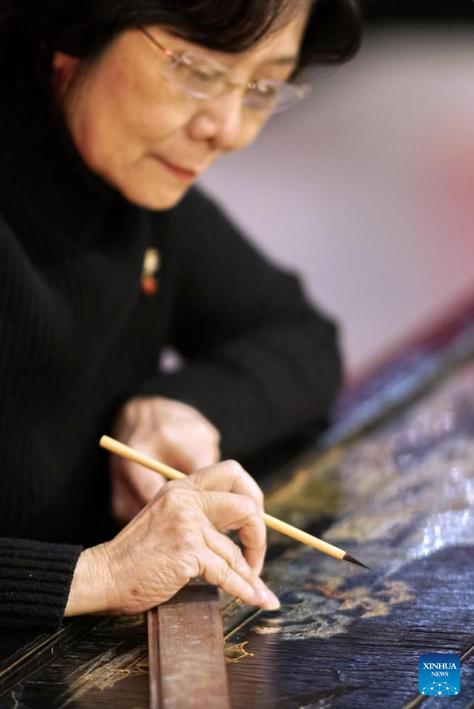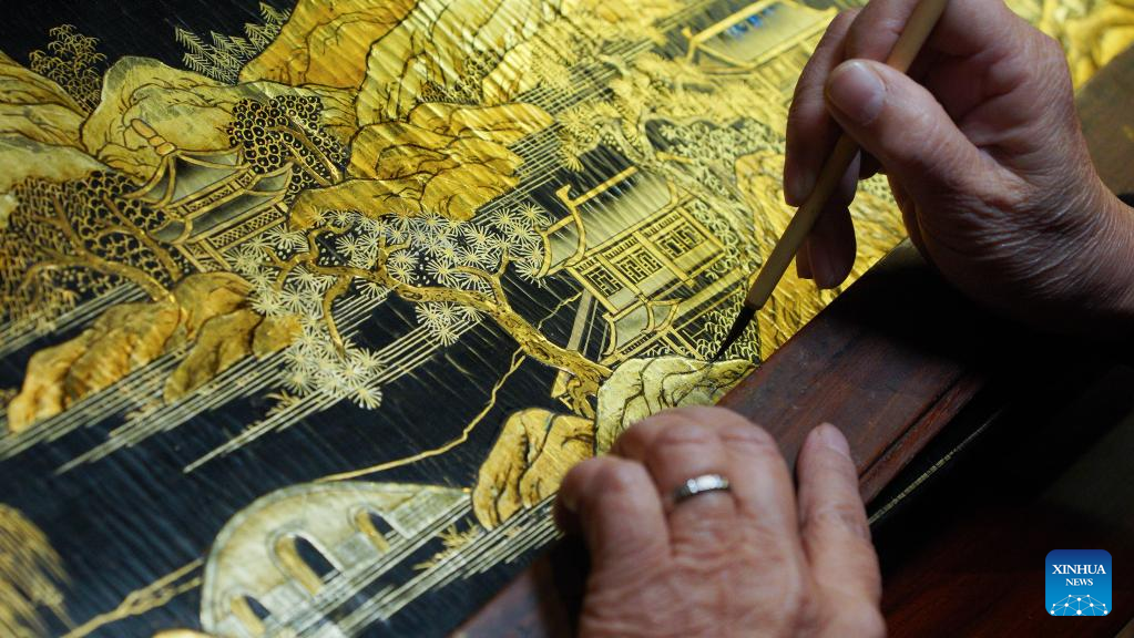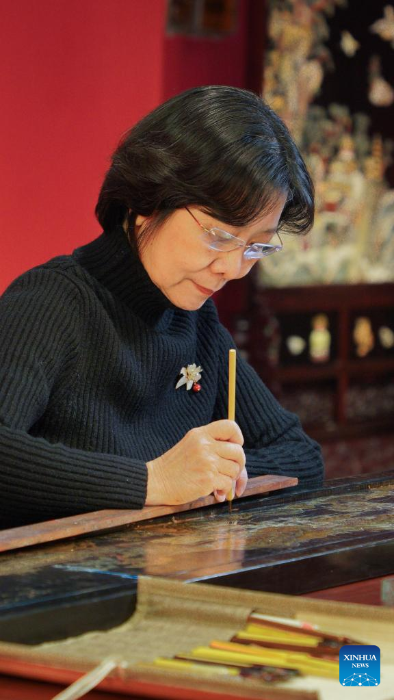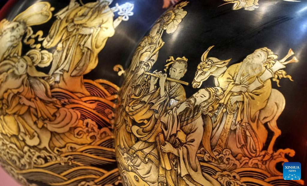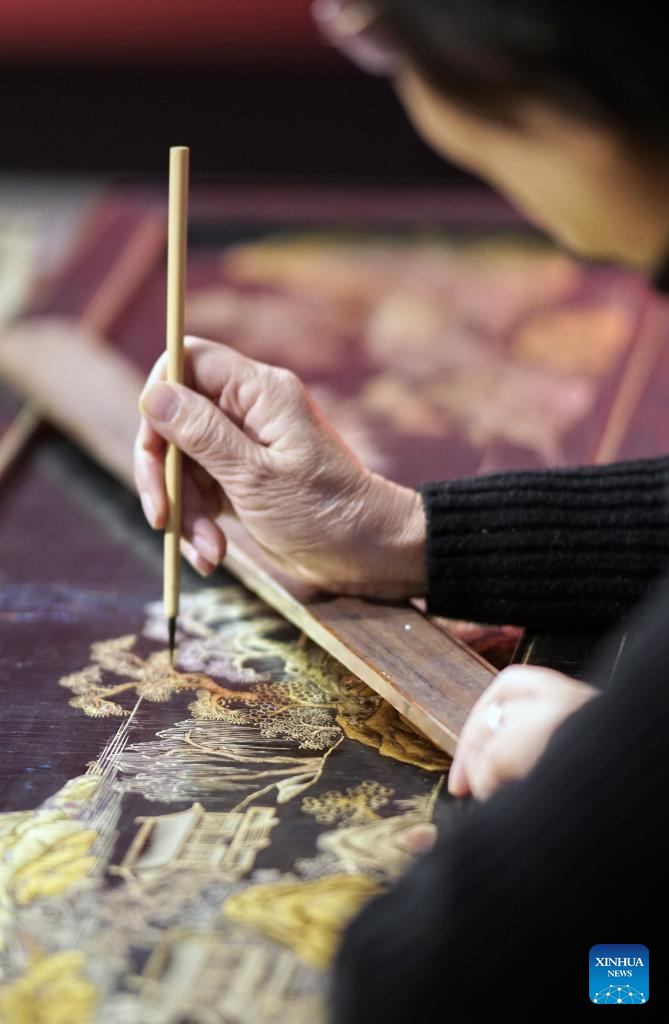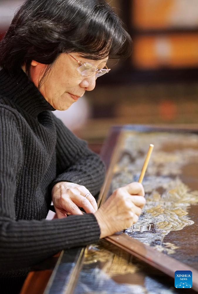 A Gold Lacquer Inlay artwork by Hu Xin is made at the Beijing Gold Lacquer Inlay Art Museum in Beijing, capital of China, Dec. 10, 2024. (Xinhua/Zhu Weixi)