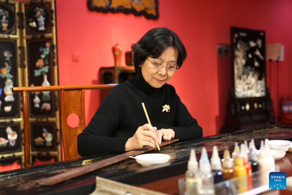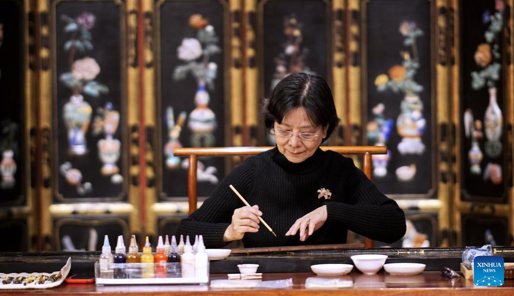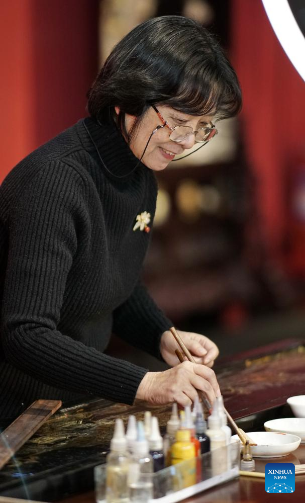 Hu Xin paints colors on a Gold Lacquer Inlay artwork at the Beijing Gold Lacquer Inlay Art Museum in Beijing, capital of China, Dec. 10, 2024. (Xinhua/Zhu Weixi)