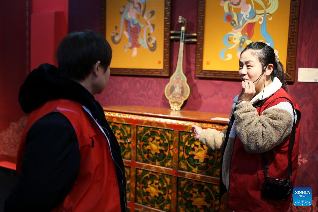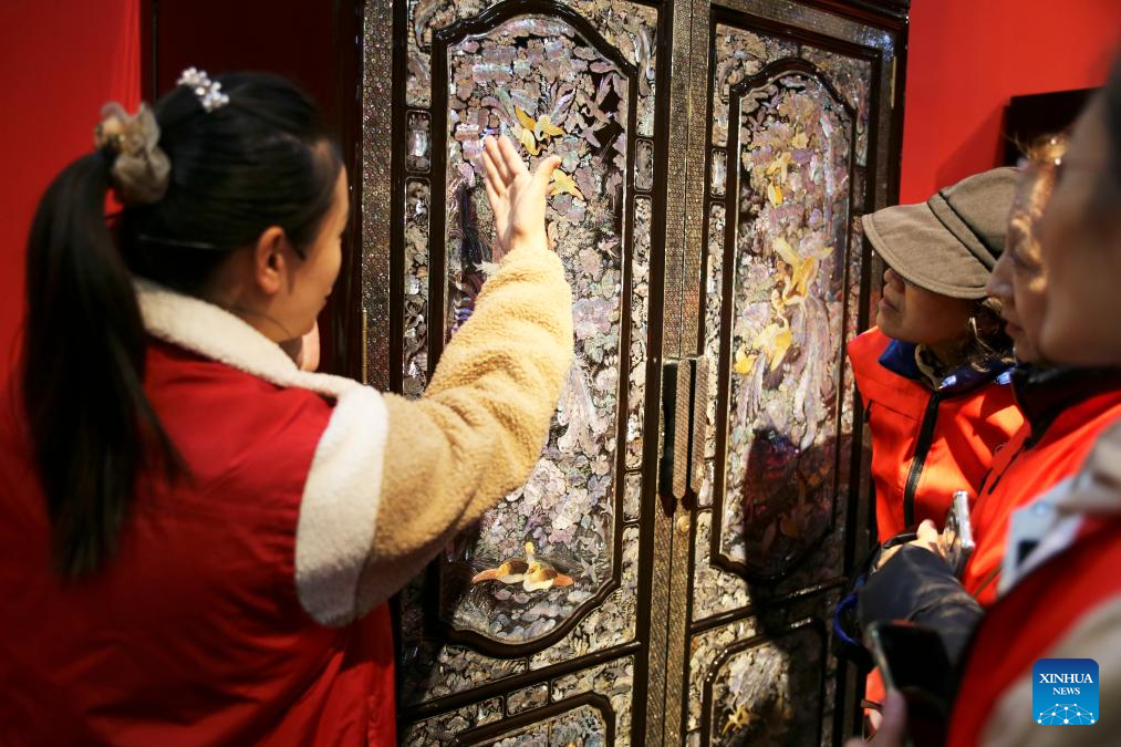 A staff member introduces a Gold Lacquer Inlay Art cabinet to visitors at the Beijing Gold Lacquer Inlay Art Museum in Beijing, capital of China, Dec. 10, 2024. (Xinhua/Zhu Weixi)