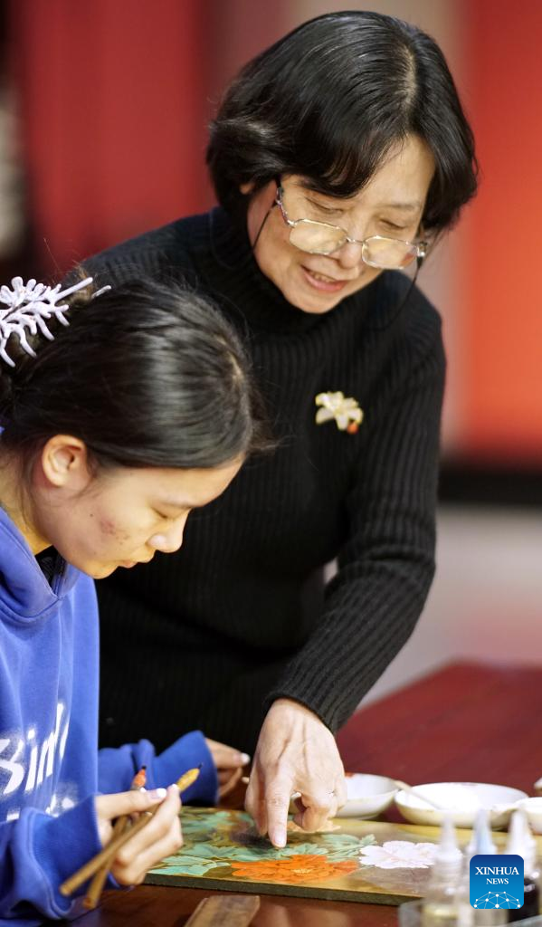 Hu Xin instructs an apprentice on a Gold Lacquer Inlay artwork at the Beijing Gold Lacquer Inlay Art Museum in Beijing, capital of China, Dec. 10, 2024. (Xinhua/Zhu Weixi)