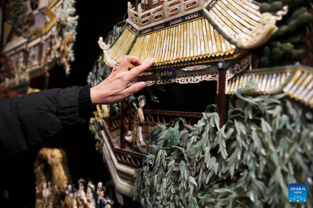 Hu Xin touches a Gold Lacquer Inlay artwork at the Beijing Gold Lacquer Inlay Art Museum in Beijing, capital of China, Dec. 10, 2024. (Xinhua/Qi Zhiyue)
