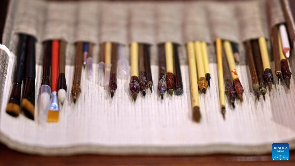 Hu Xin prepares to paint colors on a Gold Lacquer Inlay artwork at the Beijing Gold Lacquer Inlay Art Museum in Beijing, capital of China, Dec. 10, 2024. (Xinhua/Li Xin)
