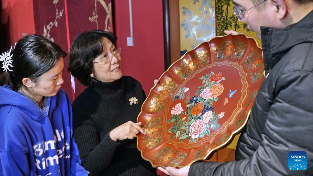 Hu Xin (R) introduces a masterpiece of Gold Lacquer Inlay Art to her apprentices at the Beijing Gold Lacquer Inlay Art Museum in Beijing, capital of China, Dec. 10, 2024. (Xinhua/Li Xin)