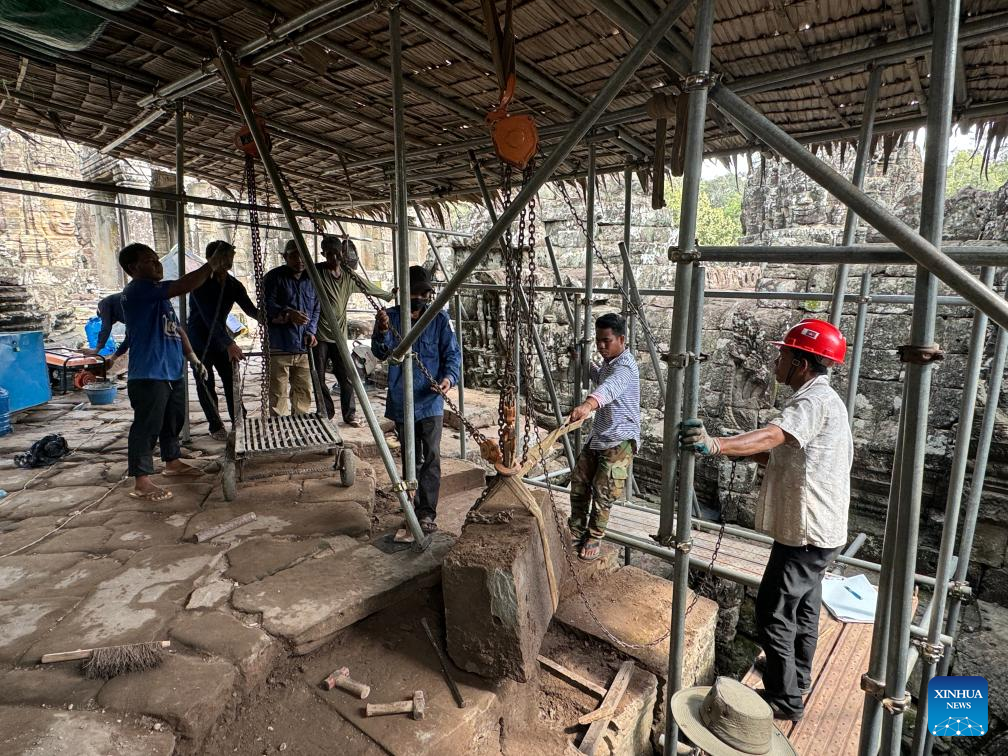 Staff members work at the restoration site of the third terrace at Bayon Temple in Siem Reap province, Cambodia on Sept. 7, 2024. Restoration work on the third terrace at the southwest corner of Bayon Temple in Cambodia's Angkor Archaeological Park has been completed successfully, the APSARA National Authority said in a news release on Dec. 19. (APSARA National Authority/Handout via Xinhua)