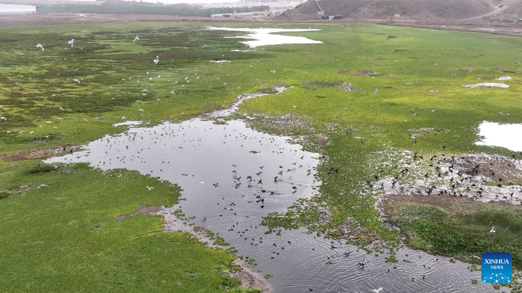 An aerial drone photo taken on June 23, 2024 shows a view of a wetland near Chancay Port, Peru.