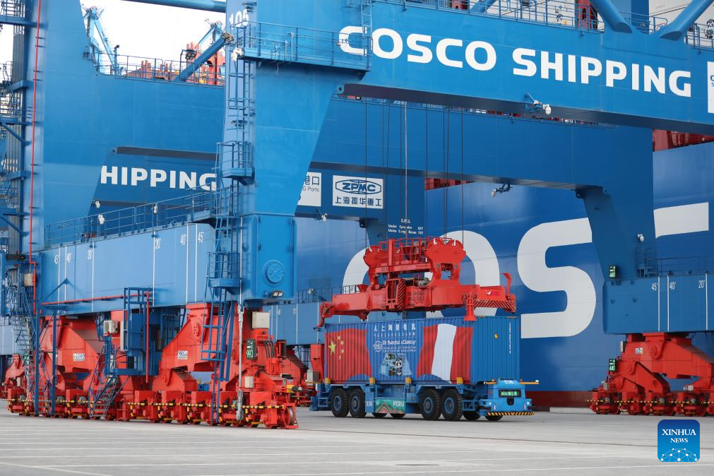 The "Xin Shanghai," a vessel operated by China COSCO Shipping Corporation Limited, arrived in Shanghai's Yangshan Port on Wednesday after a 23-day journey from Peru's Chancay Port, becoming the first vessel to arrive in Shanghai from Chancay after the Peruvian port officially opened in November. The journey also marked the opening of two-way operational sea link between Shanghai and Chancay Port, the fir st smart and green port in South America.