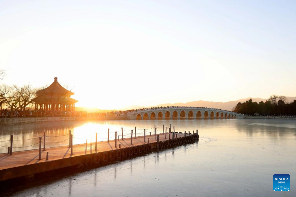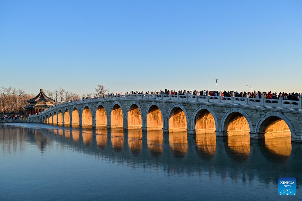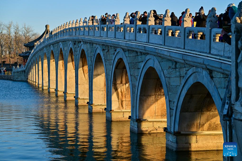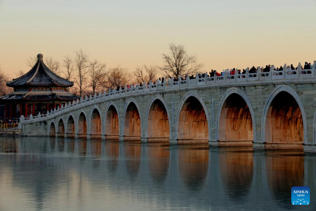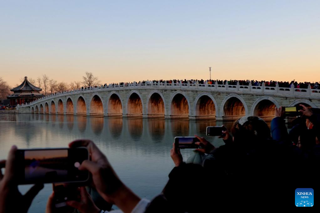 Visitors take photos of the illuminated 17-Arch Bridge at sunset in the Summer Palace in Beijing, capital of China on Dec. 22, 2024. (Xinhua/Xing Guangli)