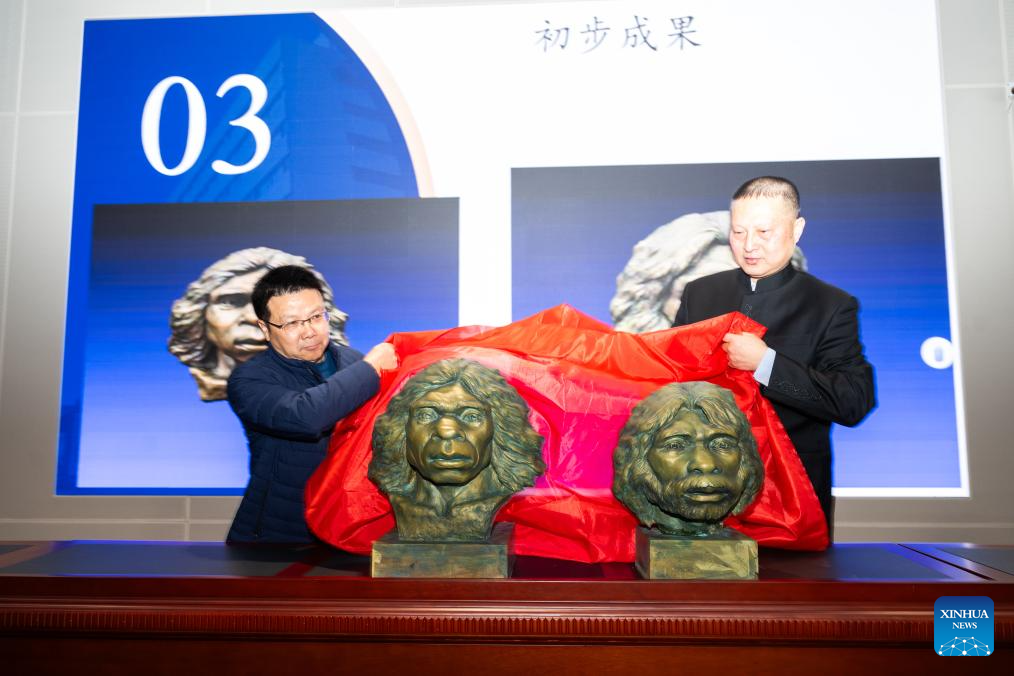 The restored statues of a pair of fossil human skulls dating back to one million years ago are unveiled at the Hubei Provincial Museum in Wuhan, central China's Hubei Province, on Dec. 26, 2024. The restored statues were unveiled by the Hubei Provincial Museum in central China on Thursday.