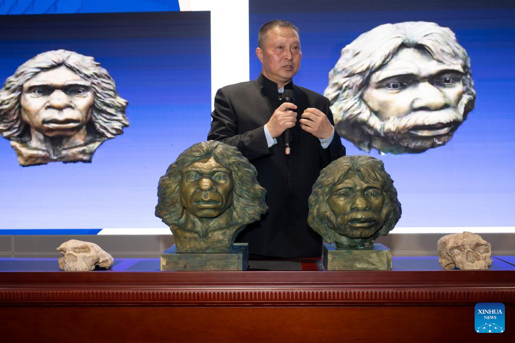Feng Xiaobo, a professor of Shanxi University, introduces the restoration process of a fossil human skull dating back to one million years ago at the Hubei Provincial Museum in Wuhan, central China's Hubei Province, Dec. 26, 2024. The restored statues were unveiled by the Hubei Provincial Museum in central China on Thursday.