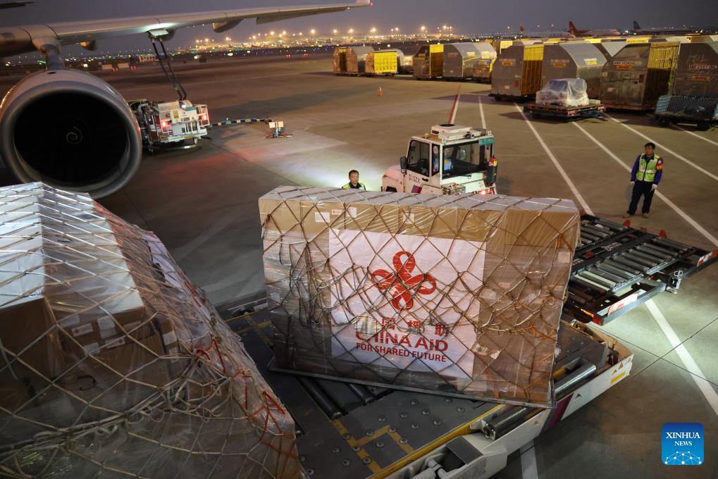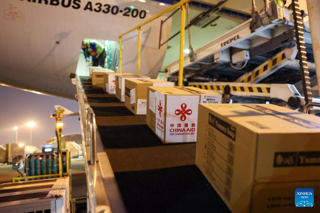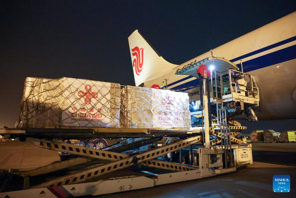 Emergency relief supplies with "China Aid" marks are transported onto a plane at Shenzhen Baoan International Airport in Shenzhen, south China's Guangdong Province, Jan. 1, 2025.(Xinhua/Liang Xu)