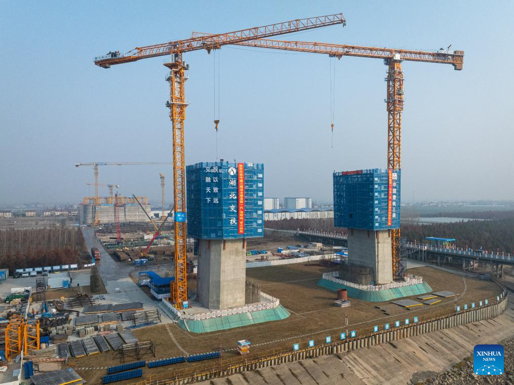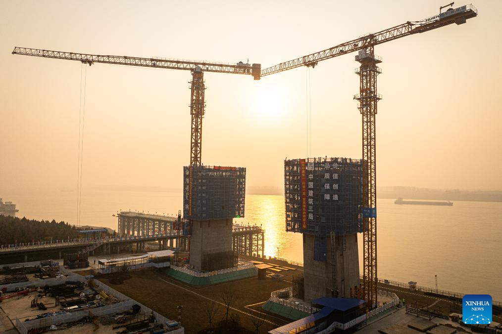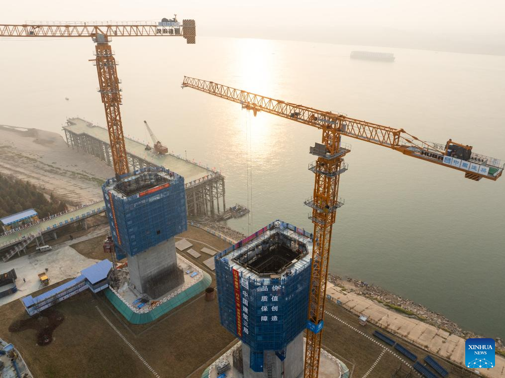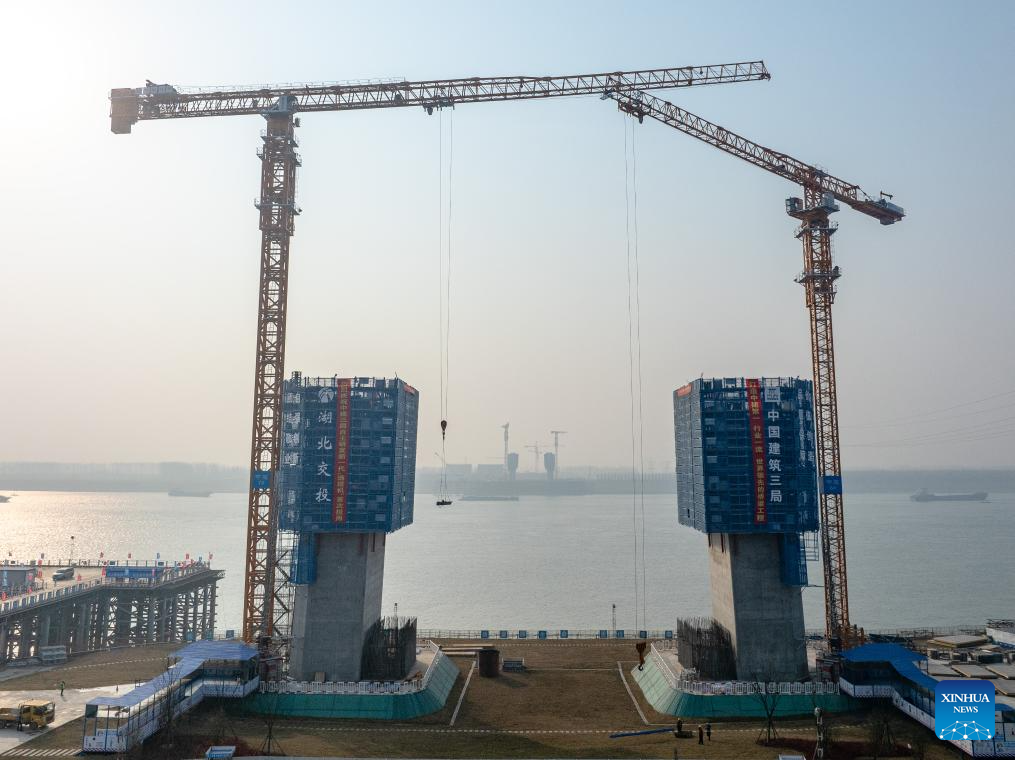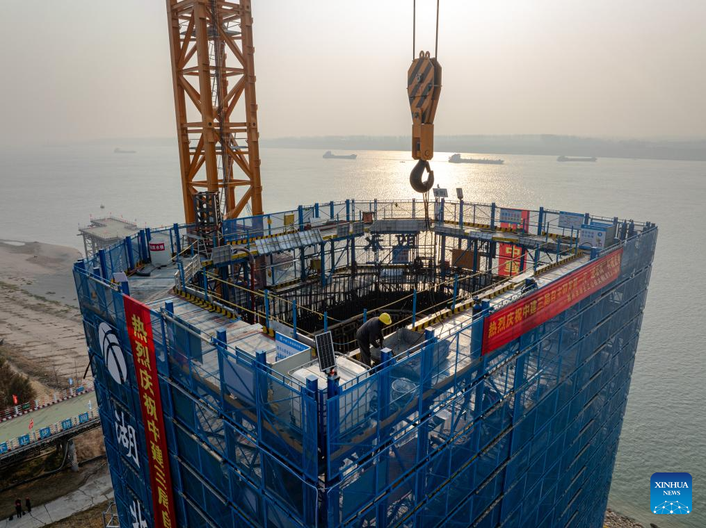 This aerial drone photo taken on Jan. 3, 2025 shows a new generation lightweight smart construction platform at the north tower construction site of Libu Yangtze River road-rail bridge project in Jingzhou, central China's Hubei Province.