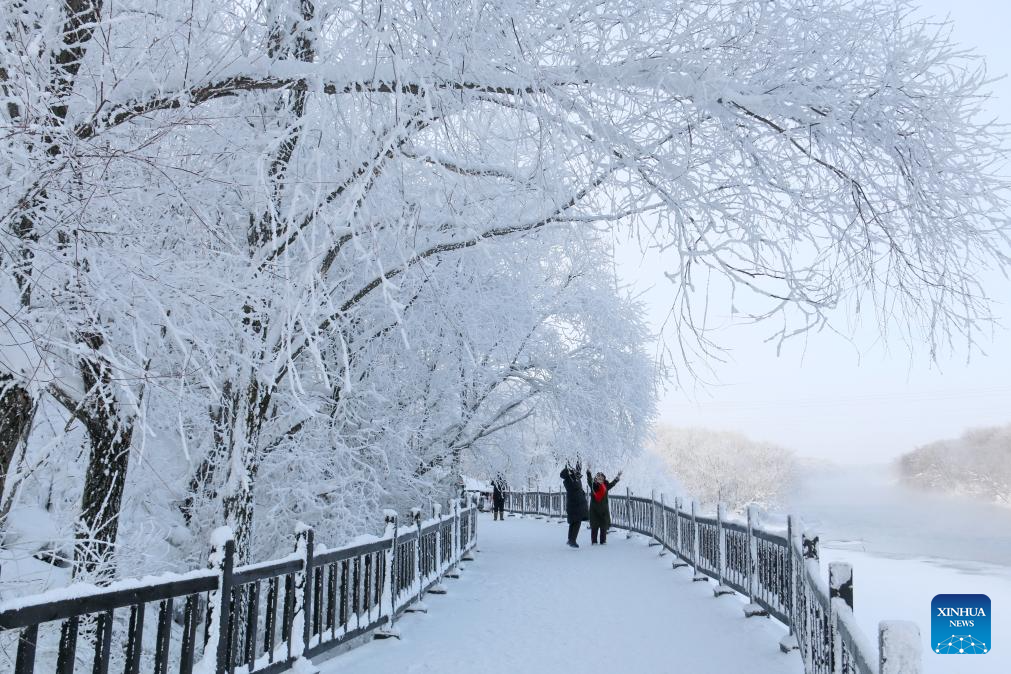 People enjoy rime scenery at a scenic spot in Wudalianchi, northeast China's Heilongjiang Province, Jan. 4, 2025. (Photo by Lu Wenxiang/Xinhua)