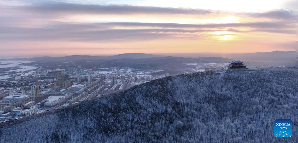 An aerial drone photo taken on Jan. 4, 2025 shows rime scenery in Fuyuan, northeast China's Heilongjiang Province. (Photo by Qu Yubao/Xinhua)