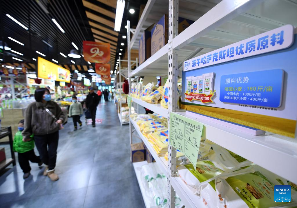 Customers view wheat flour products from Kazakhstan at a store in the Xi'an Chanba International Port in Xi'an, northwest China's Shaanxi Province, Jan. 10, 2025.