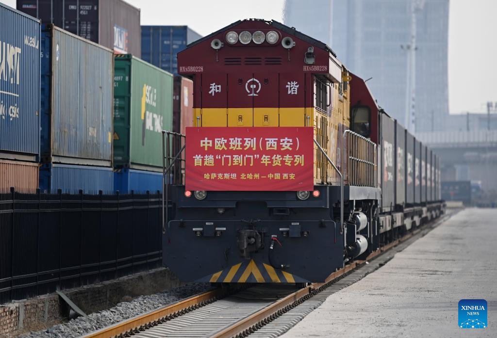 A China-Europe freight train arrives at the Xi'an Chanba International Port in Xi'an, northwest China's Shaanxi Province, Jan. 10, 2025.